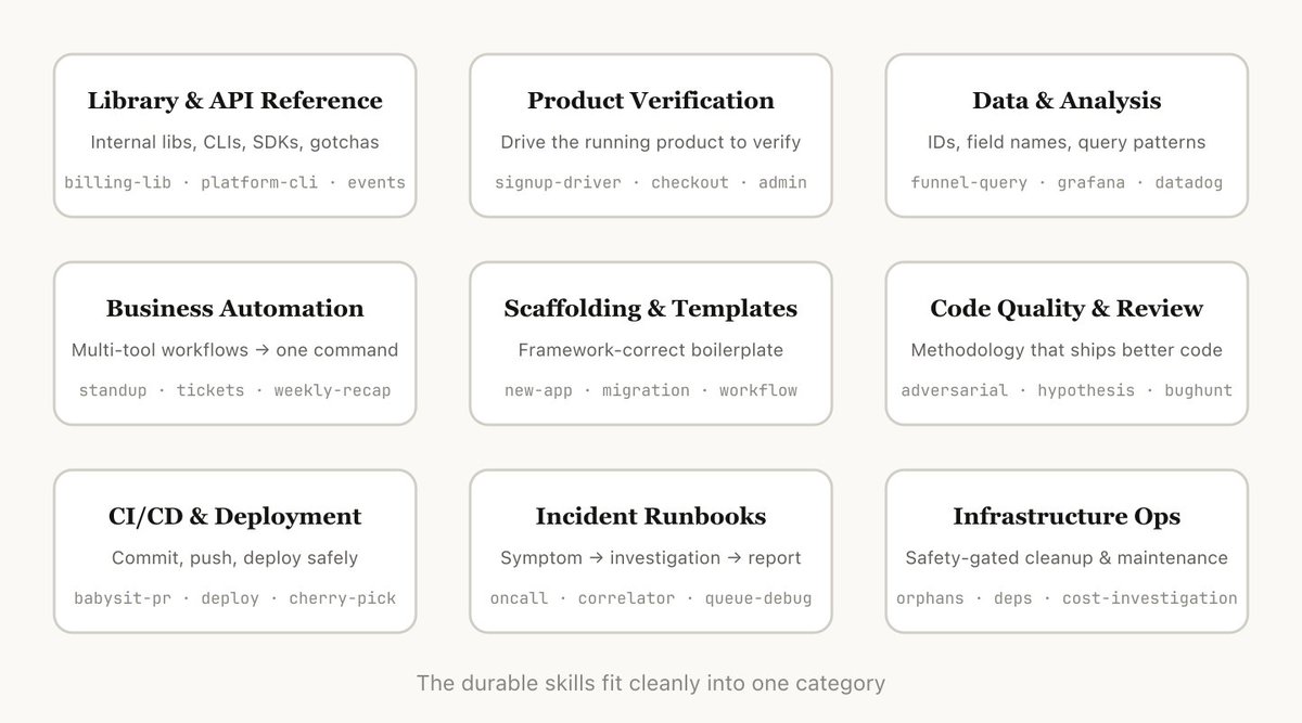 After cataloging all of our skills, we noticed they cluster into a few recurring categories. The best skills fit cleanly into one; the more confusing ones straddle several. This isn't a definitive list, but it is a good way to think about if you're missing any inside of your org.