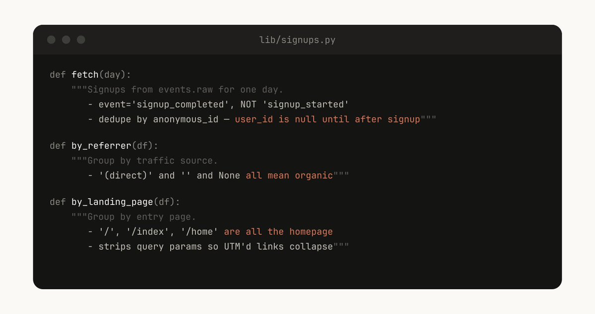 For example, in your data science skill you might have a library of functions to fetch data from your event source. In order for Claude to do complex analysis, you could give it a set of helper functions like so: