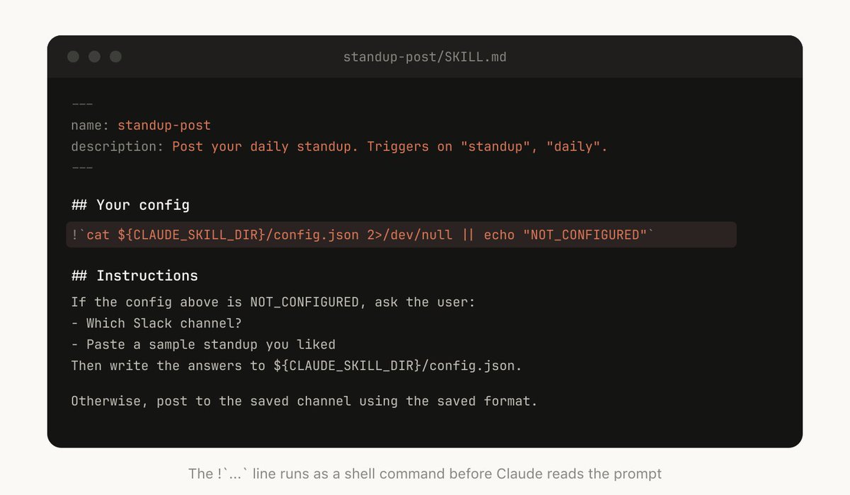 Some skills may need to be set up with context from the user. For example, if you are making a skill that posts your standup to Slack, you may want Claude to ask which Slack channel to post it in.