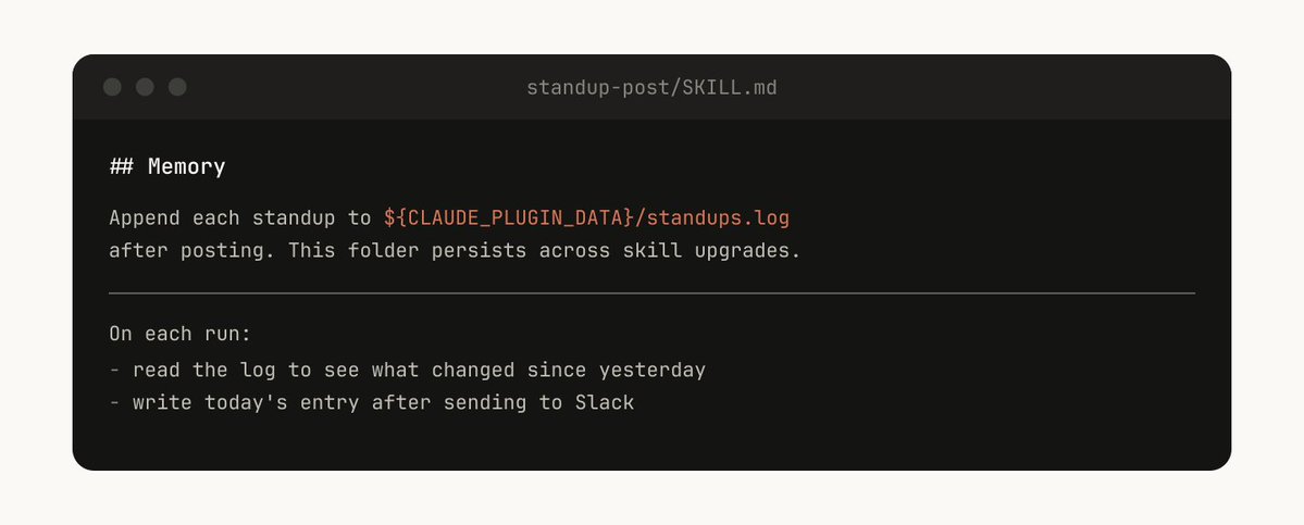 For example, a standup-post skill might keep a standups.log with every post it's written, which means the next time you run it, Claude reads its own history and can tell what's changed since yesterday.