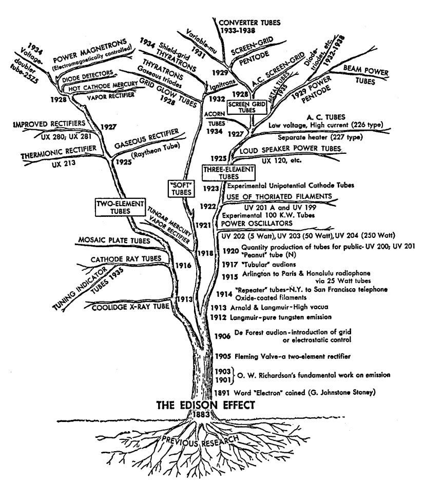 After paying $50,000 (roughly $1.6 million in 2026 dollars) for the rights to the audion, Arnold and others at AT&T spent the next year turning it into a practical electronic amplifier: the triode vacuum tube. By June 1914, vacuum tube amplifiers were being installed on a transcontinental telephone line connecting New York and San Francisco, and in January of 1915 the transcontinental line was inaugurated at the Panama-Pacific International Exposition with a call between Alexander Graham Bell in New York and Thomas Watson in San Francisco. By the late 1920s, AT&T was using over 100,000 vacuum tubes in its telephone system, and triodes and their descendents (four-element tetrodes, five-element pentodes) would go on to be used in all manner of electronic devices, from radios to TVs to the first digital computers.