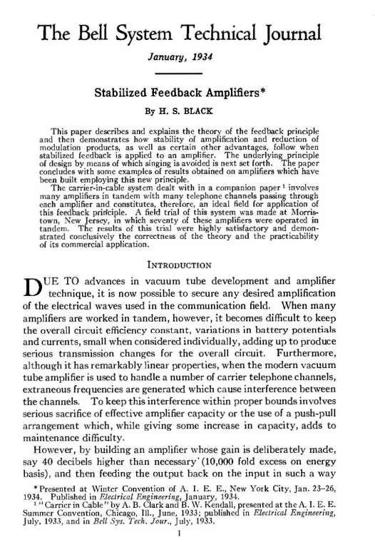 In 1921, Harold Black, a 23 year old electrical engineer, joined AT&T. He soon produced a report analyzing the future potential of a transcontinental telephone line carrying thousands of carrier-modulated conversations. At the time, carrier modulation was being used to carry at most three calls on a single line. Black’s analysis showed that such a line would require an amplifier with far less distortion than existing vacuum tubes,and Black began to work on developing an improved amplifier as a side project.