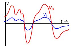 Electronic amplification: the blue is the voltage of the input signal, which varies over time. The red is the amplified voltage of the output signal. The gain of this amplifier is three: output voltage is 3x input voltage. Similar amplification can be done for electrical current. Via Wikipedia.