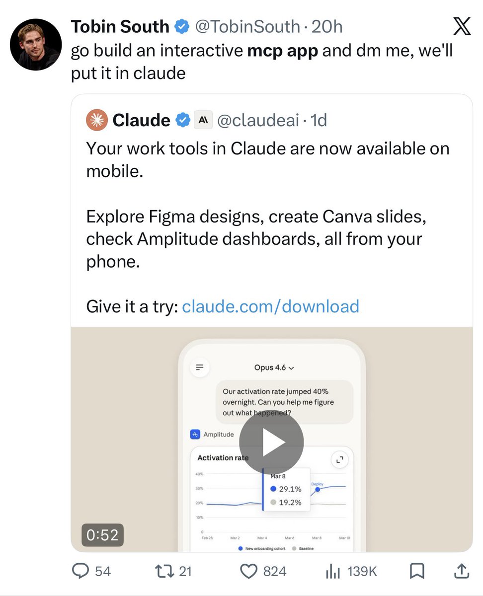 Anthropic 的品味依然无人能及。 - 某个酷东西出来了 - 没人用它做什么 - Anthropic 终于说「好吧,我们自己来」 - 然后这东西就爆了 当初唱衰 MCP 的人真的蠢到家了,你现在绝对应该开始构建 MCP 应用。 --- 引用自 @mckaywrigley:等大众发现通过 MCP apps 实现用户 <> 模型之间的双向通信时……