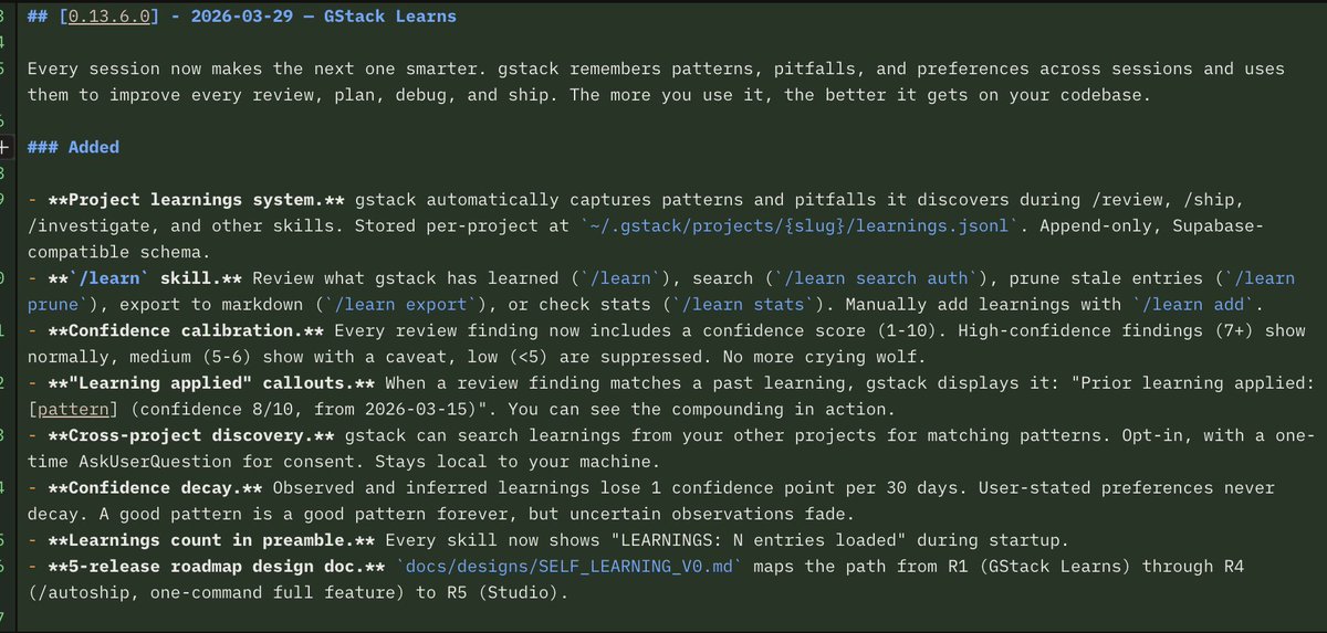 GStack 现在能从你的开发方式中学习,并将这些学习应用到未来的运行中。总是遇到 N+1 查询问题?CLI 有些奇怪的 flag 一直让你出错? 每次迭代,我们都在积累经验,从这里出发可以越来越好。(灵感来自 Every 的 Compound Engineering,致谢!)