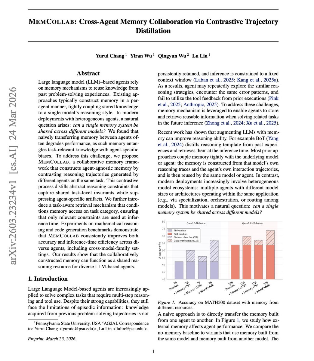 Agent 在执行任务时会积累有用的 memory,但这些 memory 被锁死了。 核心问题是:单一 memory 系统能否在不同模型间共享? 把 memory 迁移到另一个模型时,性能往往不升反降。 新研究揭示了原因并给出了解法。 MemCollab 使用对比轨迹蒸馏(contrastive trajectory distillation)将通用任务知识与 agent 特有的偏差分离开来。它对比不同 agent 的推理轨迹,提取出捕获任务层面共性的抽象推理约束。然后通过任务感知检索系统,在正确的时机应用正确的约束。 当团队运行使用不同模型的异构 agent 时,协作记忆就成为共享的推理资源,而不是负担。 MemCollab 在数学推理和代码生成任务上提升了准确率和推理效率,即使跨模型家族也有效。